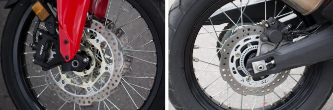 4-поршневых оппозитных суппортов Nissin с радиальным креплением хватает с запасом, кроме вышеупомянутого чрезмерно раннего срабатывания антиблокировки, претензий никаких. А вот про внедорожный режим ABS рассказать стоит отдельно – в нем отключается система лишь сзади, позволяя блокировать колесо, в то время, как передок остается под контролем.