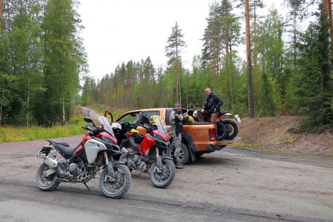 Лучшим ответом на вопрос стала организованная российским представительством Ducati экспедиция через Карелию на самую северную точку западной части России — полуостров Рыбачий, причем добрую половину из 6000 пройденных километров составляли грунтовки различного качества. И никаких перелетов до места. Нет, все по-взрослому: старт и финиш в Москве, часть ночевок в палатках, серьезные физические нагрузки… Машиной сопровождения служил Volkswagen Amarok Canyon с трехлитровой дизельной «шестеркой». А кроме моего Enduro в поход отправились «турист» Multistrada 950 S и Scrambler Desert Sled.