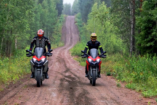 Первые 700 километров асфальта до Санкт-Петербурга стали лишь началом погружения в самобытную красоту Русского Севера. На асфальте Ducati 1260 Enduro все так же бесподобен — ни 30-литровый бензобак, ни честные 254 кг снаряженной массы (не считая опционных кофров, вместе с системой крепления добавляющих еще около 15 кг) никак не повлияли на его характер. Это все тот же злой нейкед, но со всеми удобствами «туриста», четко отслеживающий малейшие желания водителя, легко съедающий любую дорогу и выстреливающий до трехзначных скоростей на уровне сверхдорогих 500-сильных спорткаров. И все это в связке с высочайшим уровнем комфорта и относительно умеренным аппетитом: на платном участке с разрешенными 130 км/ч получалось 6,4 литра на 100 км. Плюс регулирующееся по высоте ветровое стекло и круиз-контроль. Один из лучших современных «дальнобойщиков»! В нем еще нет экстремизма КТМ с его беспощадным лозунгом «Ready to Race», но, к счастью, здесь и не пахнет пенсионерским «гусем» со 135-сильным двигателем даже в последней итерации и торчащими вбок цилиндрами — сборниками камней, пеньков и прочих радостей жесткого бездорожья.