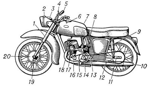 11 номер покажет вам заднюю вилку (маятник). 12 — это цепь (цепной привод). Под номером 13 указан двигатель (его картеры). 14 представлен ведущей звездочкой. 15 — это моторная цепь. Номер 16 указывает на левую крышку картера (мотора). 17 — поршень. 18 — цилиндр (в народе именуемый, как «поршневая»). Под номером 19 на мото схеме продемонстрированы тормозные колодки переднего колесного барабана. Ну и 20 — это уже сам барабан переднего колеса.