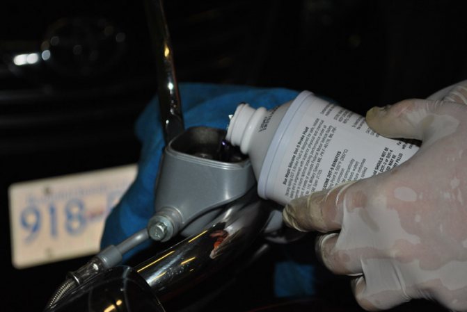 Данное средство является едким, состоит из химических веществ, поэтому оно может повредить поверхность мотоциклов. В любом случае всегда следует использовать во время проведения данной процедуры перчатки, стирать подтекания на поверхности мотоцикла, если прольется жидкость. Вначале следует вылить имеющуюся жидкость с бака в специальную посуду. Для этого следует отсоединить бачок, затем наклонить его, можно также вытащить средство с помощью шприца, груши из ТС. Во время проведения всех работ необходимо проследить за уровнем жидкости в баке. Не позволяйте остаться без жидкости отверстию бака, иначе она может попадать в воздух. В некоторых случаях потребуется прокачивать длительное время транспортное средство.