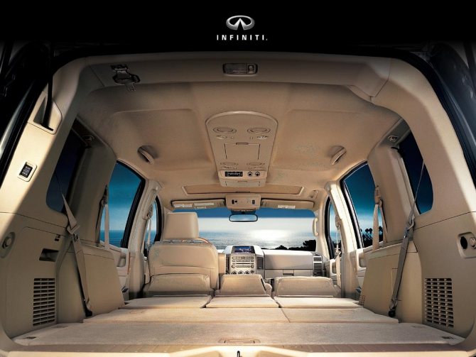При желании, можно подключать приставку либо наслаждаться просмотром фильмов. Кроме того, infiniti qx56 имеет третий ряд, где с комфортом могут путешествовать два пассажира. Кресла второго ряда можно быстро сложить с помощью кнопки прямо из багажного отделения. У пятой двери имеется электропривод, позволяющий ей открываться полностью.