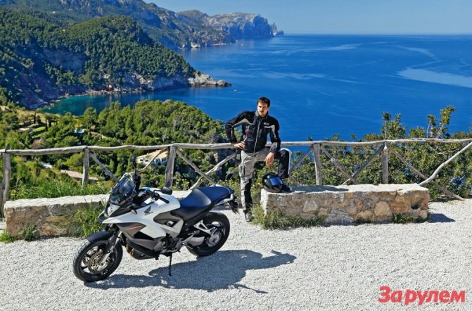 Отдельного упоминания заслуживают покрышки. Crossrunner обут в специально разработанные для него шины Pirelli Scorpion Trail. Они имеют вполне асфальтовый рисунок, но, как и весь мотоцикл, несут легкий намек на внедорожность. Двухкомпонентный состав протектора (более жесткий по центру и мягкий по краям) решает извечную дилемму между долговечностью и «держаком». И эта технология действительно себя оправдывает. Несмотря на очень скользкий асфальт на горных серпантинах Майорки, где проходил тест, покрышки позволяли укладывать мотоцикл до подножек, а уж если заднее колесо и срывалось в занос, «отловить» мотоцикл не составляло особого труда. По заверениям специалистов Honda и Pirelli, комплект резины может служить до 15 тыс. км. Разумеется, всесторонне испытать новые шины однодневный тест не позволяет, но аналогичная резина на Ducati Multistrada 1200 показала себя превосходно.