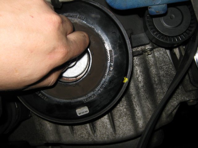 Теперь надо ослабить болт шкива коленвала. Помощник садится за руль, включает 5 передачу и нажимает до упора на тормоз, а Вы надеваете на ключ для увеличения усилия кусок трубы отворачиваете этот болт.