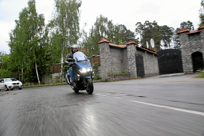 Больше всего в ТиМаксе подкупают его мощный и тяговитый двигатель и правильный вариатор, очень быстро реагирующий на изменения, происходящие с дроссельной заслонкой. Я это говорю скорее не как мотоциклист, а больше как человек, поездивший на разных машинах с вариаторными трансмиссиями. На большинстве тачек вариаторы тупят, а самые четкие клиноременные трансмиссии были, как сейчас помню, на Subaru Forester и WRX последних поколений. Вот и у ТиМакса тоже правильный вариатор. А еще у него прекрасно сбалансированное шасси со спортивными задатками. В итоге из всего этого получается очень шустрый, но при этом комфортный скутер.