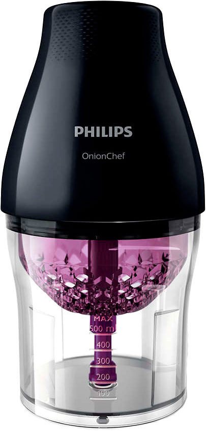 Philips HR2505/90 — долговечный прибор с пластиковой чашей емкостью 1,1 л обрабатывает ингредиенты с мощностью 500 Вт. В комплектации идет универсальный нож и терка. Автоматический выбор скорости облегчает использование чоппера. Включается с помощью нажатия на кнопку. Стоимость 4500 р. Достоинства: