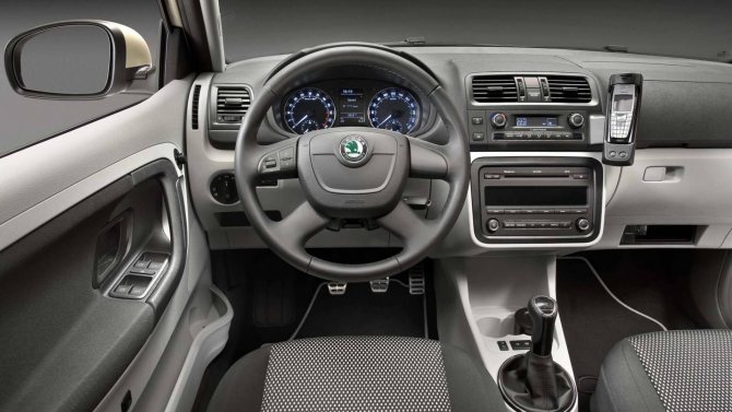 Несмотря на то, что Skoda Fabia 2 является бюджетным вариантом, это никак не отражается на внутреннем оформлении или на материалах низкого качества. Интерьер лишен ярких красок и роскоши, однако на высоком уровне эргономика. К новшествам, которые появились во 2 поколении Шкода Фабия, можно выделить разъем для iPod. Если использовать оригинальную магнитолу Beat или Dance, можно подключить свой кассетный, CD или MP3-плеер, а также iPod.