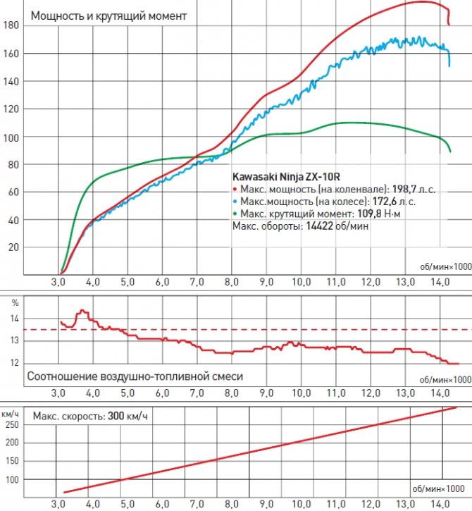 Но где же самый мощный в классе двигатель, и где дивиденды от одного из самых передовых и легких шасси? Ведь на мощностном стенде мотоцикл показал очень близкие к заявленным заводом характеристики! Да и оснований не доверять официальным цифрам в плане снаряженной массы также нет. Дело, как обычно, в деталях: в не самой короткой базе, в несколько ином, чем у оппонентов, распределении и централизации масс, в слегка другой эргономике места пилота, возможно, еще в каких-то невидимых на первый взгляд нюансах… Ну и, конечно, главный момент: все свои беспощадные самурайские силы двигатель отдает практически на пике оборотов — на 13 000 об/мин. В городе использовать весь потенциал с такими настройками просто невозможно, да и на треке получается дуальная ситуация: либо вы держите сумасшедший темп истинного чемпиона, поселив электронного «червя» тахометра к отметке 13 000 об/мин, или вы печально исполняете роль туриста, наблюдая, как мимо вас проплывают счастливые обладатели «моментных» на средних оборотах аппаратов. Вот такая правда жизни —столь же суровая и беспощадная, как ночные убийцы ниндзя, приносящие тихую смерть своим «клиентам».