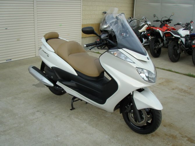 Выбор и покупка. Летом 2013-ого, после 10 лет вождения автомобиля наконец-то открыл категорию А. Открыл, потому-что хотел сделать город доступней. Понял, что не дождусь пока Собянин победит пробки и надо что-то менять. Для меня вопрос мобильности очень важен, так как приходиться часто ездить через всю столицу вдоль и поперек. Решение, что нужен максискутер пришло быстро. Основываясь на имеющемся на тот момент опыте вождения двухколесной техники, а это Ёбрик в мотошколе (5 занятий) и тайваньский скутер SYM Orbit 50 (километров 300) на даче, пришел к выводу что большой скутер подойдет лучше всего. Он будет скоростной, как мотоцикл и простой в управлении, как обычный скутер. Во всяком случае тогда мне казалось именно так. Хотя мечтал я о чоппере, и понимал, что беру максискутер в качестве учебной парты. Дальше нужно было выбрать модель. Почитал в интернете, походил по салонам, пообщался с друзьями-мотоциклистами и решил, что нужен б/у японец в 400 кубов, хотя изначально рассматривал и SYM и кубатуру поменьше. Покупать SYM я передумал, после чтения обзоров (новые они хороши, но дороги, а к пробегу в 10-20 тысяч сильно «устают» по технике), а не брать 250 кубов отговорили друзья, т.к. слабоваты они для езды в потоке по МКАД. Набрал денег и в декабре пошел в салон продажи б/у скутеров из Японии.Там увидел с десяток Majesty 400, штук 8 Silver Wing 400, несколько Skywave 400 и 600. T-max тоже были, но их я отмел сразу из-за цены. Все из Японии и с пробегом в 15-20 тысяч км. Silver Wing понравился больше остальных: дизайн и двухцилиндровый мотор, но они были немного дороже. Skywave показался не очень внешне, а вот Yamaha подошла и по цене и внешне ничего. Из представленных моделей выбрал вариант с минимумом тюнинга, т.к казалось, что скорей всего на нем должны были меньше всего и вваливать. И вот я стал владельцем почти байка 2006 год выпуска с пробегом в 17 000 км. Оценки в аукционнике 4-5. Пару потертостей по пластику, прожиг седла окурком.