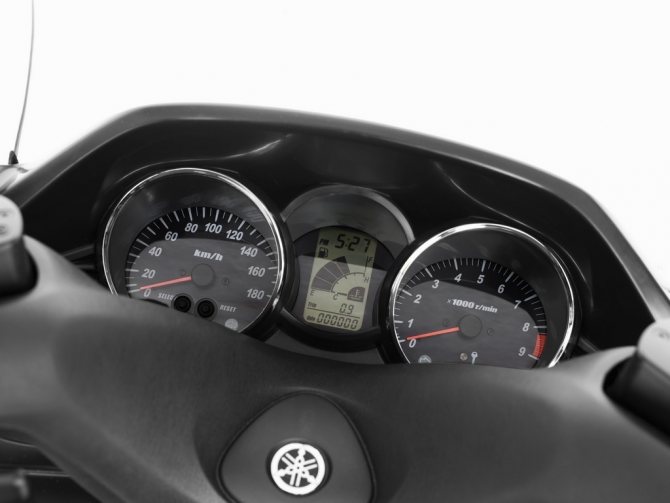 Приборная панель Yamaha Majesty 400 довольно мала, будто перебравшись с малолитражного мотоцикла. На ней стандартные спидометр, тахометр и уровень топлива, одометр, на котором можно посмотреть межремонтный, общий и суточный пробеги, а также индикаторы ручника, дальнего света и поворотников.