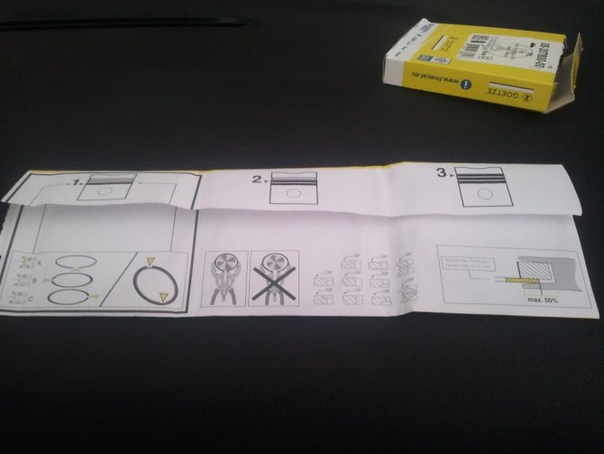 Затем надеваются второе и первое компрессионные кольца. На компрессионных кольцах есть надпись “TOP” (верх). Эта надпись должна быть направлена к днищу поршня. Кольца очень хрупкие! Установку колец нужно производить специальным инструментом, который равномерно распределяет нагрузку на кольцо, чтобы не сломать. В самом крайнем случае, при отсутствии специнструмента, установить кольцо можно руками, очень аккуратно разгибая его.