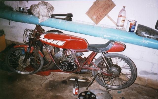 Еще один такой мопед, видна головка двигателя Vairas. Мопеды с такими двухскоростными моторами использовались в юниорских соревнованиях. Конечно, всем желающим таких мопедов не хватало, были и другие варианты ,например, самодельные конструкции.