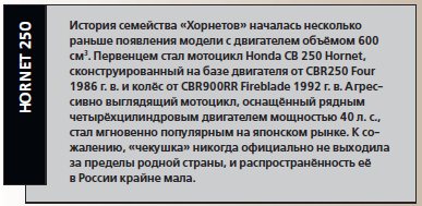 У большинства людей, как известно, аппетит приходит во время еды, а у конструкторов Honda – в ходе совершенствования своих мотоциклов. Начиналось все скромно: в 1995 году на японском рынке дебютировал 250-кубовый Hornet – эдакая «серая мышка», машинка на каждый день. Но уже через пару лет «шершень» (так переводится с английского Hornet) стал солиднее – объем мотора увеличился до 600 см3 – и вышел на европейский рынок. Honda вполне устраивало высокое место модели в мировом табеле о рангах, и выпускался бы мотоцикл еще долго в этой кубатуре, если бы не активные телодвижения конкурентов. Сначала Suzuki выпустила модернизированный Bandit 1200, потом Yamaha ошарашила всех изящным FZS1000 Fazer. Для Honda ничего не оставалось, как лихорадочно закрыть брешь в нише неоклассиков. В конце 2001 года из гнезда вылетел новый «шершень» – CB900F Hornet.