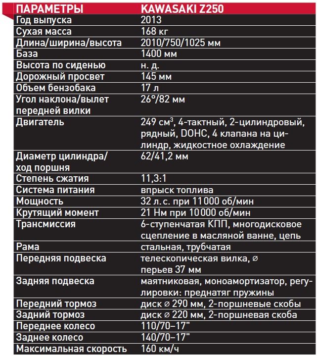 »Это не могло не случиться — выход модели Z250 был лишь вопросом времени! Спустя пять лет после дебюта сверхпопулярного 250-кубового спортбайка Kawasaki Ninja 250R четвертого поколения японский концерн, наконец, решился представить нейкед-версию мотоцикла, которая еще до запуска в серийное производство была обречена на успех… Но продается «дорожник» Z250 только в странах Азии (и то не во всех): ни в Европе, ни в Северной Америке модель не представлена! С 2014 года мотоцикл будет доступен и на российском рынке.