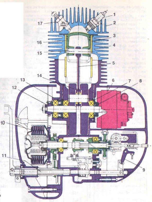 Разрез силового агрегата мотоцикла «К-175»: 1 — свеча зажигания; 2 — головка цилиндра; 3 — гильза цилиндра; 4 — цилиндр; 5 — шатун; 6 — генератор; 7 — шарикоподшипник коленчатого вала; 8 — правый сальник коленчатого вала; 9 — рычаг механизма выключения сцепления; 10 — сцепление; 11 — валик педали переключения передач; 12 -звездочка моторной передачи; 13 — левый сальник коленчатого вала; 14 — коленчатый вал с маховиками;15 — поршневой палец; 16 — поршень; 17 — клапан декомпрессора.