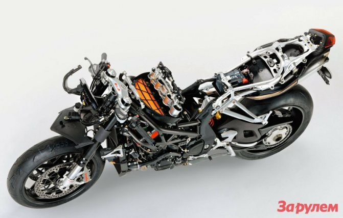 Но это все лирика, вернемся к «железу». F4 вернулся в стан «тру литров», мотор в основном как у нового Brutale («Мото», №11–2009), отличия большей частью — в «голове». Титановые клапаны, восемь форсунок впрыска, изменяемая длина впускных патрубков — вот и набралось 186 л.с. и получилась «удобная» характеристика крутящего момента. Последнее еще и за счет утяжеления на 2 кг коленвала — уж больно резок на реакции был предшественник. В целом же мотоцикл похудел на 10 кг — только на фаре, а она теперь с ксеноном, сэкономили полтора кило, пластик каким-то образом полегчал на 1,9 кг, «обезжирены» еще бак, маятник и колеса. И хотя 192 кг сухой массы далеко не рекорд для спортбайков, на ходу это совершенно не ощущается, а значит, все сделано правильно.