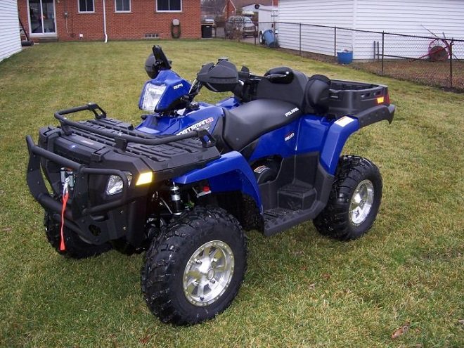 - Polaris Sportsman 500 Touring. Это непросто рабочая лошадка, а полноценный туристический квадроцикл. После изменений, внесённых производителем, аппарат обзавёлся более мощным двигателем (39 лошадиных сил), пассажирским сиденьем и получил более привлекательный дизайн. Машина отлично показывает себя как на трассе, так и на пересечённой местности.