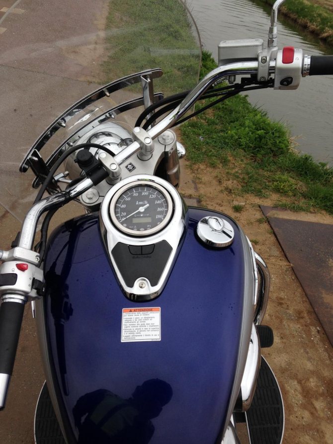 Вид с места водителя ничем не хуже С1500 с огромной фарой, в которой эффектно отражается Intruder лого с ветровика и проплывающие сверху облака, и кроны деревьев. Две мощные трубы передней вилки амортизаторов дополняют «паровозный» вид. Сами приборы вмонтированы в бак (мне почему-то нравится, может потому что Харлейная классика?), при этом в Boxer V8 видимость вполне нормальная, сильно опускать голову не приходиться. Вот в обычном закрытом шлеме ситуация может быть другой, и для проверки скорости пришлось бы опустить голову и оторвать взгляд от дороги. Но или приборы «красиво на баке», или «неэстетично».
