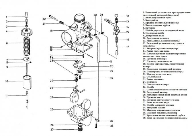 Для начала посмотрим из каких деталей состоит карбюратор Микуни: