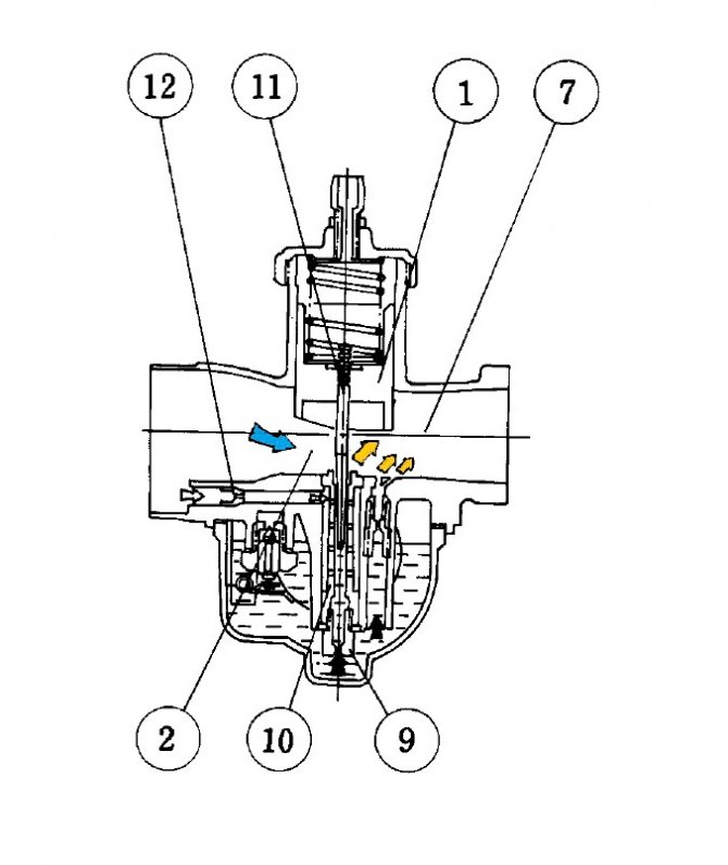 Топливо поступая через главный жиклер (9) в смесительную трубку (10) смешивается с воздухом поступающим через воздушный отверстие (12), и через распылитель попадает в диффузор (2).