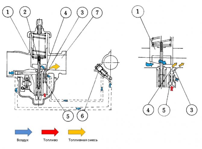 Поступающее через жиклер холостого хода топливо также смешивается с воздухом поступающим через переходное отверстие, и через распылитель холостого хода попадает в выпускное отверстие (7), а далее в двигатель.
