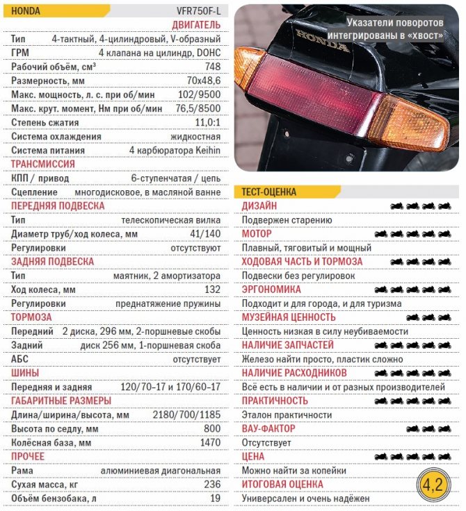Но совсем неуправляемым любителем прямиков VFR750F назвать нельзя – он на скорости тоже поворачивает, просто делает это не сам и резко, а только по команде, предсказуемо и плавно. Ходовые повороты автобана в предгорьях Альп проходить на нём одно удовольствие, извилины Пятницкого шоссе ранним воскресным утром, пока дачников нет, тоже. 104-сильный двигатель быстро разгоняет мотоцикл примерно до 180 км/ч, после чего темп разгона падает, но стрелка спидометра продолжает ползти дальше. У нас на тесте была японская версия со снятым ограничителем скорости, спидометр её заканчивался на о. У полносильных американцев и европейцев спидометр размечен до 280 км/ч, но положить стрелку не получится – не хватит мощности. Максималка у VFR750F с трудом дотягивает до 240 км/ч. Но «двушку» он едет стабильно и уверенно: по дороге не рыскает, рулём не трясёт, при обгоне фур на полполосы в сторону не шарахается. Настоящий спорт-турист – быстрый, стабильный и удобный.