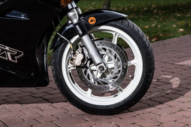 Тормозные диски диаметром меньше 30 см и плавающие двухпоршневые суппорты – для 1991 года это был стандарт, тогда и на настоящих спортбайках такое можно было найти, но по нынешним меркам это уже «не то». Тормозит мотоцикл уверенно и предсказуемо, но для того, чтобы современную цепкую покрышку, далеко ушедшую в своём эволюционном развитии за последнюю четверть века, заблокировать на чистом и сухом асфальте, приходится давить всей пятернёй. Установкой армированных шлангов, подбором хороших колодок и регулярным очищением дисков Brake Cleaner-ом эта проблема минимизируется, но полностью, к сожалению, не решается.