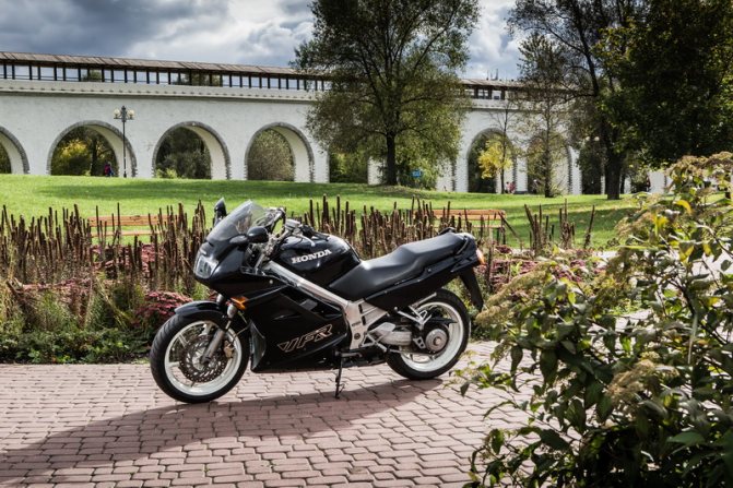 «Минусы» — байк спорт-турист, найти неушатанный вариант очень сложно. Сразу признаюсь, свой байк я искал с середины декабря по начало апреля, за это время пересмотрел 12 вариантов. — из-за своей веса требователен к резине (хотя уже постаревший «Мишка Пилот 2» отлично справляется с этой задачей) — байк 100% спорт-турист, при этом штаны выхлопной системы идут очень низко, занижая при этом дорожный просвет. Цепануть трубами самодельного во дворе асфальтового «лежачего полицейского» не составит труда. — радиаторы стоят по бокам, лучше поставить слайдеры или клетку, в противном случае даже при не сильно большом падении есть риск встрять на дорогостоящий ремонт… — тяжелые выхлопные трубы, расположенные под хвостом, + бак почти на 22 литра завышают центр тяжести — варианты 5 поколения страдают рядом болячек (электрика, стартер, генератор, регулировки клапанов и т.п). На профильном форуме «VFR клуба» кто-то даже пошутил, что «в последнее время на трассе мало встречается 5 поколение, все больше по гаражам, наверное, чинятся» © — кроме одного производителя (SG), все остальные слайдеры требуют замены или перепайки бачка ОЖ, поэтому если на байке стоят слайдеры советую проверить как они установлены, чтобы в дальнем пути не возникло «сюрпризов»