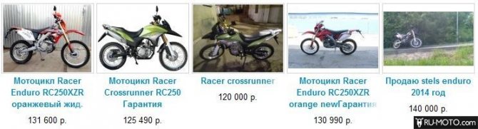 В качестве примера предельных уровней послужит стоимость практически нового Racer RC250XZR (1 км пробега) – 168,75 тыс. руб. По более низкой цене продается машина 2014 г. выпуска с пробегом 1,15 тыс. км. – 43 тыс. руб.Цены новых машин колеблятся в зависимости от региона в значительных пределах от 112 до 181 тыс. рублей.