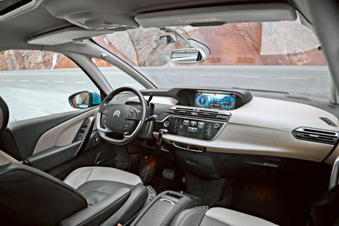 И материалы отделки радуют глаз — особенно понравился пластик торпедо, искусно имитирующий ткань, и небольшой, обтянутый мягкой кожей, руль. А над всем этим разливается море света — благодаря большим треугольным окошкам в передних стойках и панорамному лобовому стеклу, заходящему на крышу. Площадь остекления у нового «Пикассо» рекордная среди компактвэнов — почти пять с половиной квадратных метров.