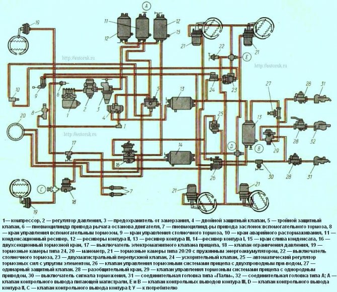 1 — передняя тормозная камера; 2 — клапан контрольного привода; 3 — звуковой сигнал; 4 — контрольная лампа; 5 — двухстрелочный манометр; 6 — кран аварийного растормаживания стояночного тормоза; 7 — кран стоячного тормоза; 8 — кран вспомогательного тормоза; 9 — кран ограничения давления; 10 — компрессор; 11 — пневмоцилиндр привода рычага останова двигателя; 12 — регулятор давления; 13 — пневмоэлектрический датчик включения электромагнита пневмоклапана прицепа; 14 — предохранитель от замерзания; 15 — пневмоэлектрический датчик падения давления в контуре; 16 — воздушный баллон контура рабочего тормоза колес задней тележки и контура аварийного растормаживания; 17 — кран слива конденсата; 18 — пневмоцилиндр привода механизмов вспомогательного тормоза; 19 — тройной защитный клапан; 20 — двойной защитный клапан; 21 — двухсекционный тормозной клапан; 22 — аккумуляторные батареи; 23 — воздушный баллон контура рабочего тормоза колес передней оси и контура аварийного растормаживания; 24 — воздушные баллоны контура стоячного тормоза и контура тормозов прицепов; 25 — воздушный баллон контура вспомогательного тормоза; 26 — пружинный энергоакумулятор; 27 — задняя тормозная камера; 28 — перепусковой клапан; 29 — ускорительный клапан; 30 — автоматический регулятор тормозных сил; 31 и 32 — клапаны управления тормозами прицепа соответственно с двухпроводным и однопроводным приводами; 33 — одинарный защитный клапан; 34 — разобщительный кран; 35 — соединительная головка типа «Палм»; 36 — соединительная головка типа А; 37 — задние фонари.