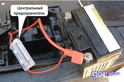 Место расположение предохранителя на аккумуляторе отмечен стрелкой