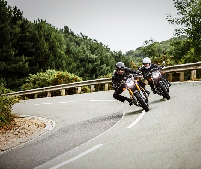 Геометрия и подвески остаются общими с моделью R. Крутой угол выноса рулевой колонки в 22,8 градусов и короткий трейл в 92 мм в сочетании с довольно короткой колёсной базой — 1414 мм — делают Thruxton RS подвижным и ловким в поворотах. На нашем пути нам встречались и серии узких S-образных поворотов, и длинные пологие дуги, и всё это Thruxton RS проходил легко и с уверенностью. Единственное, что хочу отметить — при трейл-брейкинге мотоцикл пробует распрямиться, и его приходится чуть осаживать.