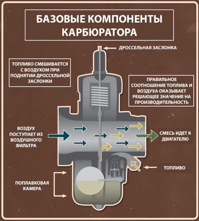 Карбюратор, самая непонятная часть в мотоцикле и многих небольших машинах. Все двигатели требуют надлежащей смеси воздуха и топлива для горения; карбюратор, контролирует соотношение топливо/воздушной смеси, поступающей в двигатель. Это звучит достаточно просто, но есть много деталей карбюратора, которые, если их не отрегулировать, в лучшем случае мотоцикл не будет ехать должным образом или, в худшем, вы не сможете его завести. Правильное соотношение топлива и воздуха имеет решающее значение для работы двигателя.