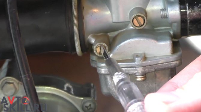 Теперь при помощи отвертки с прямой насадкой откручиваются жиклеры, болт регулировки холостого хода и винт качества смеси.