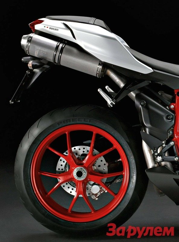 Принадлежность к марке ощущаешь даже не на взгляд — на ощупь, сидя в седле. Просторное и сбалансированное рабочее место пилота отлично знакомо. Тело заметно наклонено вперед, но без излишнего фанатизма. Высокие подножки и клипоны умеренной ширины. Бензобак с грамотными выштамповками под колени. Сидеть удобно, но… не для городских условий. А для трека? Всего секунду назад ты еще «давил», укрывшись от встречного потока за низким стеклом «итальянца», а уже мгновение спустя расправляешь плечи, поднимаешься навстречу плотному воздуху и гасишь скорость перед следующей дугой. И этот переход из одного состояния в другое проходит настолько естественно, что не требует заострения внимания на деталях. Все так, как и должно быть: тело плотно связано с мотоциклом, руки свободны. Никакой зажатости.