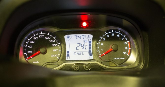 Панель приборов представляет собой 2 стрелочных колодца, на левом отображается скорость, на правом — показания тахометра, разделённые между собой дисплеем бортового компьютера. В целом, панель приятно сделана, но возможной информации выводимой на экран довольно мало и, по сравнению с электронной панелью спидометра на Хонде, показания скорости считываются не очень быстро. Хотя про обороты двигателя не могу такого сказать, с их восприятием не было проблем.