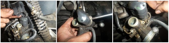 На первом этапе откручиваем 4 болта и снимаем подседельный отсек, на некоторых моделях еще отвинчивают крышку маслобака. Потом снимается воздушный фильтр, для чего освобождаем винт хомута крепления манжеты и 2 болта на 10, фиксирующие корпус. Резиновую манжету корпуса фильтра с карбюратора можно стянуть с определенным усилием. Теперь надо отсоединить бензиновый и масляный шланги. С этой целью петли хомутов сжимаются и стягиваются два шланга. Ключом на 10 отворачивают ближний болт крепления к патрубку впуска. Откручиваем второй болт внутри. На данный момент уже освобождены 2 шланга, откручены 2 болта крепления. Сейчас надо снять устройство, отвинтить крышку дроссельной заслонки и вынуть дроссель. Для окончательного освобождения устройства надо снять с фиксаторов-защелок еще защитную крышку пускового обогатителя и открутить 2 винта с прижимной скобы обогатителя.