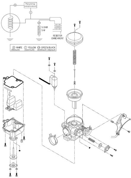 - К корпусу карбюратора крепится пусковой обогатитель: он небольшого размера, размещен в пластмассовом корпусе. Он имеет два болта с уплотнителями из резины. Питание обогатителя происходит через 12 В аккумулятор. Это устройство используется для запуска мотора на холодную, так как позволяет обогатить смесь кислородом автоматически.
