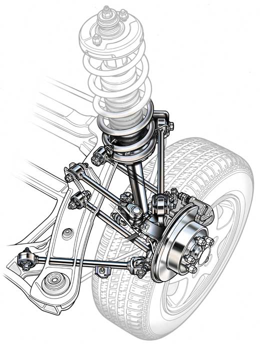 В отличии от «МакФерсона» двухрычажная подвеска более габаритна и металлоемка, хотя чуть большее количество составных частей на надежности не сказывается, но она несколько сложнее в обслуживании.