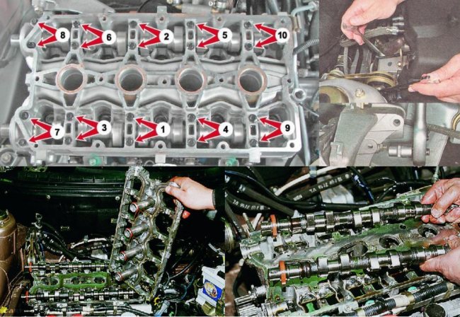 Начинается со снятия всего навесного оборудования ГБЦ (впускной и выпускной коллектора, патрубки радиатора охлаждения, воздуховод воздушного фильтра, высоковольтных проводов и свечей зажигания), защитный кожух ремня ГРМ, в результате чего открывается доступ до крепежа клапанной крышки. Откручиваем натяжной ролик ремней генератора и системы ГРМ, снимаем их, далее приступаем к демонтажу крепления крышки клапанов, выкручиваем их, получая свободный доступ к болтам ГБЦ. Выкручиваем их, после чего головку блока цилиндров можно снимать с картера движка.